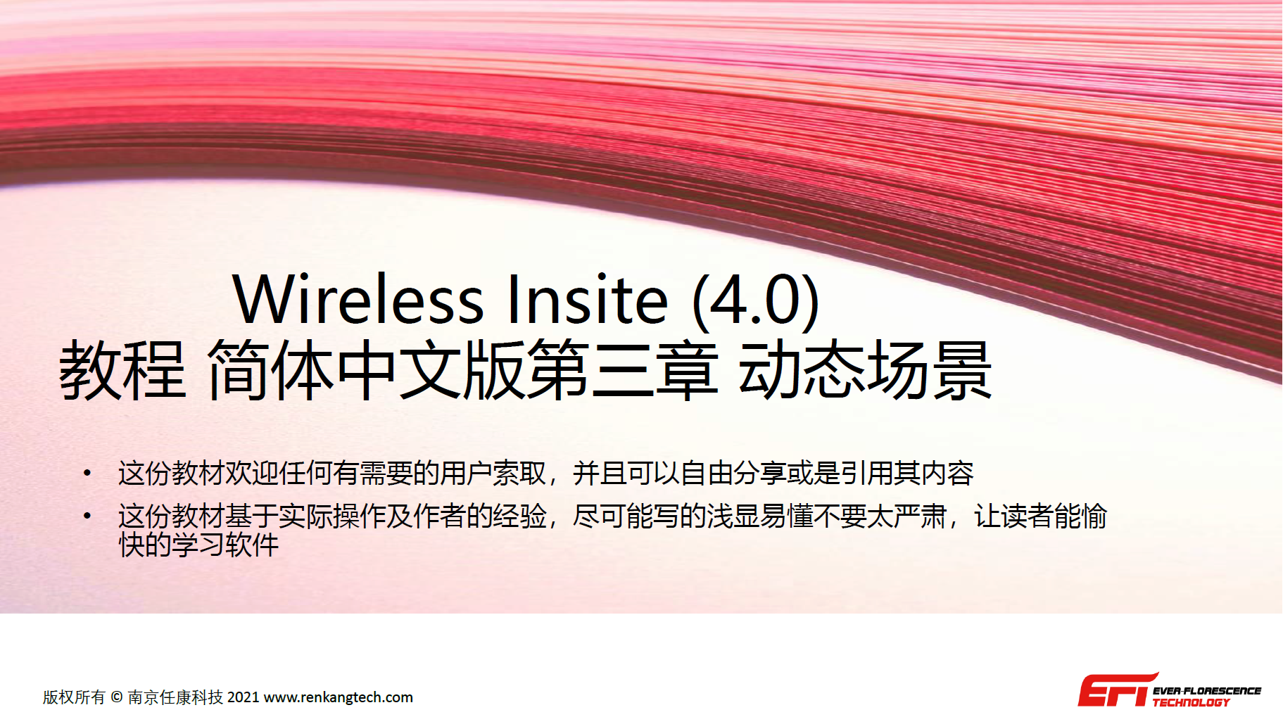 Wireless Insite 4.0 相較於之前的版本有較大改變,用戶介面經過調整,增加了新的動態平台功能,改善模擬輸出數據檢索功能,這個部分的教材有以下兩個重點